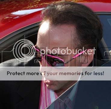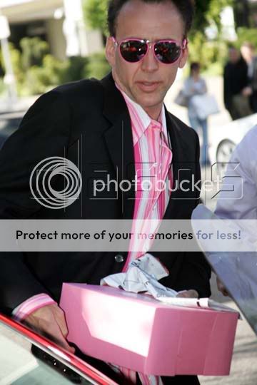 You know, I love me some Nic as much as the next hot-blooded babe, but I just don't know if I'm feeling the pink... with matching shades, no less. I don't know. I just don't know. Maybe he was going to a baby shower or something (the pink box looks like a gift)?